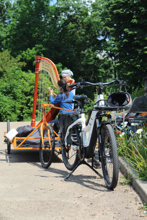 La harpe glisse près de vous, à vélo ou en auto, sur une place publique, un jardin, un salon, une église ou une salle de concert,