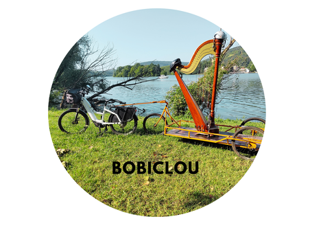 Nous transportons notre matériel, y compris la grande harpe de concert, exclusivement à vélo à l'aide d'une carriole fabriquée pour Bobiclou. Nous souhaitons ainsi limiter l'impact énergétique de nos déplacements mais aussi repenser notre rapport au temps, au voyage et à l'instant présent.